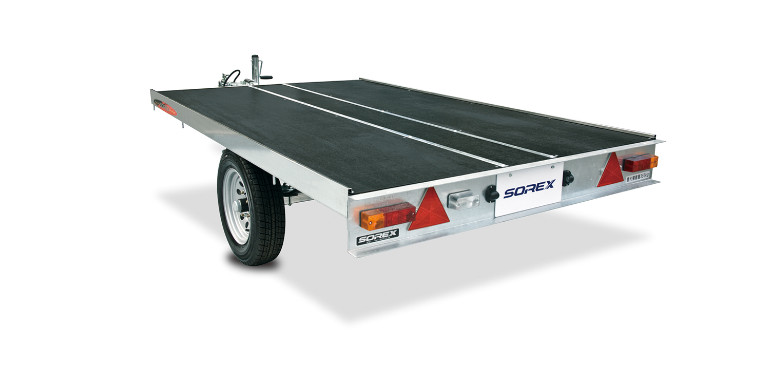 FLAT TRAILER スノーモービル2台積載可能な普通規格のフラットトレーラー 荷台傾斜時 NF-2K 今までのNF-2Kより約150mm低い 主要諸元 SPECIFICATIONS 最大積載量 1000kg 普通 1 ナンバー スノーモービル2台積 多目的 フレーム材質スチール (ガルバナイズド処理)荷台ベッドサイズ3655×2400mm全長×全幅×全高5100×2410×640mm車両重量370Kg...