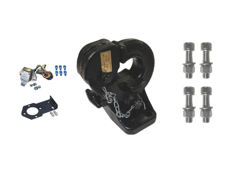 ピントルフック(4t) NEW 品番TM-007 メーカー希望小売価格32,450円(税込) 鍛造製・ブラック仕上げのピントルフックです。高い強度を備え、力強く引き締まった印象に仕上げたい場合にもおすすめです。 牽引力4tスチール製取付けボルト4本付属配線キット付属配線ブラケット(汎用)付属 オンラインショップ商品ページ