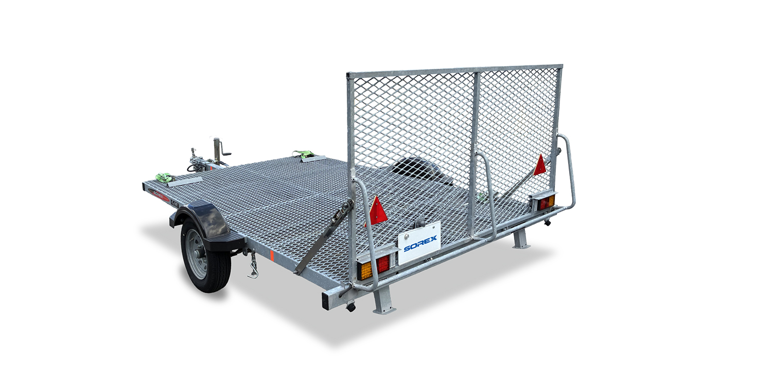 荷台傾斜タイプのフルフラットトレーラー 荷台傾斜時 NF-1 より105mm低い! NF-E エキスパンドメタル仕様 積載イメージ 主要諸元 SPECIFICATIONS 最大積載量 350kg 軽 4 ナンバー スノーモービル1台積 多目的 フレーム材質スチール (ガルバナイズド処理)荷台ベッドサイズ2400×1445mm全長×全幅×全高3390×1475×600mm車両重量190Kgタイヤサ... -