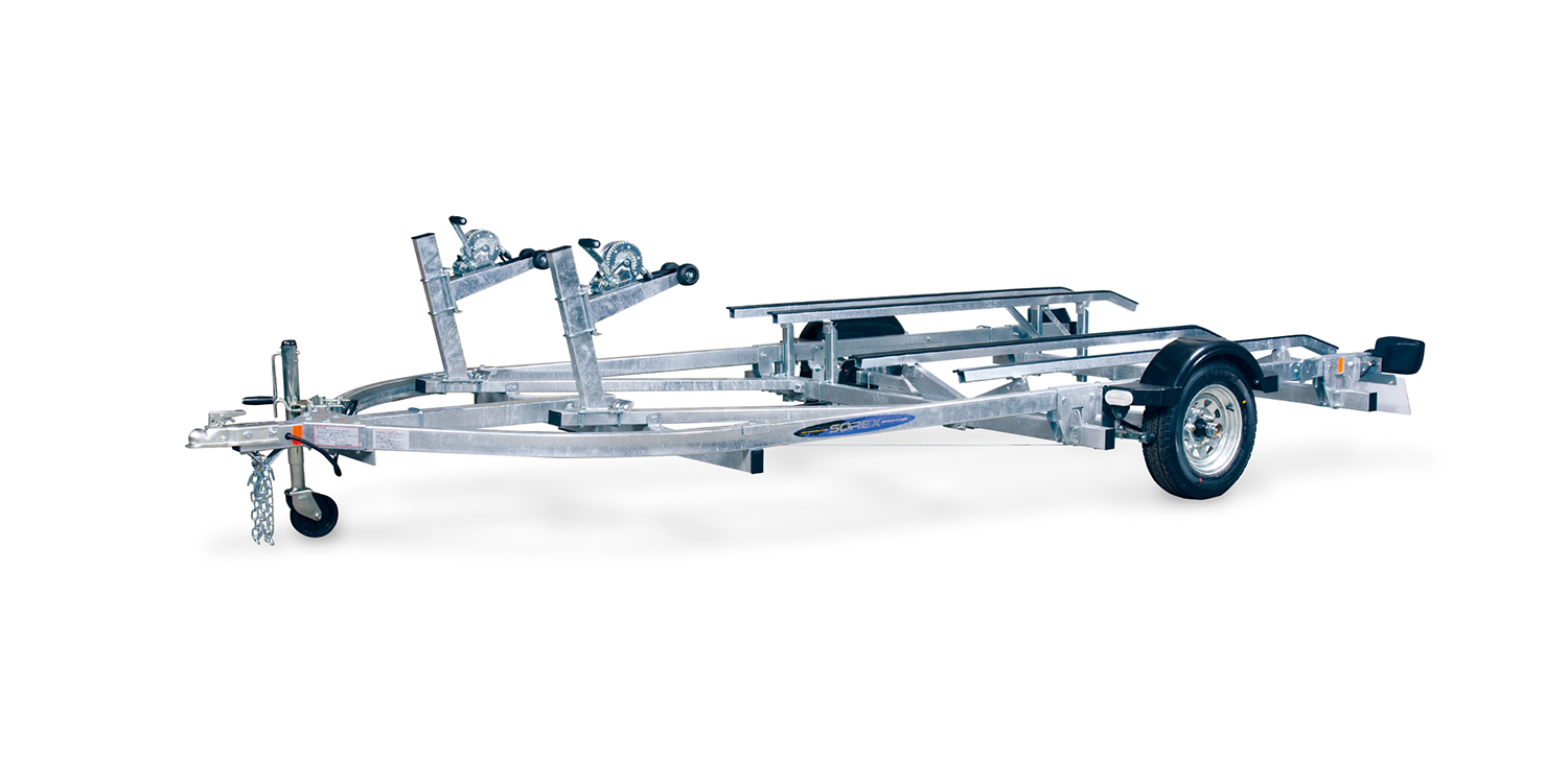 PWCの積み降ろし易さが向上したスタンディングタイプ、タンデムタイプ2艇積みトレーラー。
